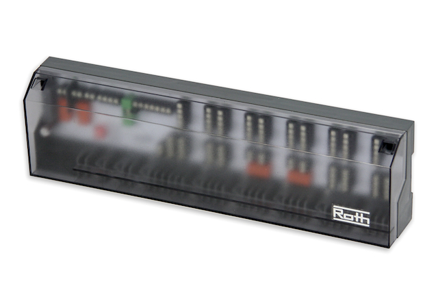Roth Anschlussmodul Basicline AM-10 230 Volt, Heizen/Kuehlen Premium Anschlusseinheit fuer die sichere und geordnete Verschaltung von bis zu 10 Roth Basicline Raumthermostaten einschlieich Heizen/Kuehlen sowie max. 18 Roth Stellantrieben. (Kanal 1 bis 10 fuer jeweils 5/2/2/1/1/1/1/2/2/4 Antriebe.) Anschlusseinheit fuer 230 V oder fuer 24 V Komponenten verfuegbar. Zur Aktivierung des Kuehlbetriebes muss am Roth Anschlussmodul der C/O- Umschaltkontakt ueber ein externes Relais geschlossen werden. Das Schaltrelais (230 V bzw. 24 V, 1 Schlier) wird z. B. von der Roth Waermepumpe angesteuert und ist pro Anschlussmodul im Verteilerschrank einzuplanen. Ausstattung: LED-Anzeigen, optionaler Eingang fuer Roth Kondensationswaechter / Feuchtefuehler, Pumpenausgang mit einstellbarer Nachlaufzeit fuer eine bedarfsgerechte Pumpensteuerung, Absenkeingang zur Weiterschaltung des Absenksignals bei Anschluss einer Zeitschaltuhr. Hochwertiges Gehaeuse mit normgerechter Zugentlastung. Fuer die Montage im Roth Verteilerschrank auf Hutschiene oder auf Verteilerschrankrueckwand verschraubt.