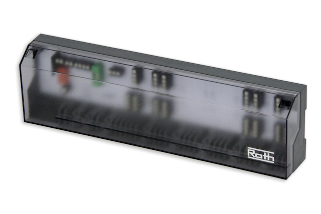 Roth Anschlussmodul Basicline AM-6 Anschlusseinheit fuer eine sichere und geordnete Verschaltung von bis zu 6 bzw. 10 Roth Raumthermostaten Basicline H 230 V oder Basicline T sowie max. 16 (AM-6) bzw. 18 (AM-10) Roth Stellantrieben 230 V. Ausschlieich fuer 230 V Komponenten geeignet. Anzahl der Stellantriebanschluesse: - Das AM-6 mit Kanal 1 und Kanal 6 fuer jeweils 4/2/2/2/2/4 Antriebe. - Das AM-10 mit Kanal 1 bis Kanal 10 fuer jeweils 5/2/2/1/1/1/1/2/2/4 Antriebe. Mit Pumpenausgang fuer eine bedarfsgerechte Pumpensteuerung und Absenkeingang zur Weiterschaltung des Absenksignals bei Anschluss eines Uhrenthermostates. Hochwertiges Gehaeuse mit normgerechter Zugentlastung. Fuer die Montage im Roth Verteilerschrank auf Hutschiene oder auf der Verteilerschrankrueckwand aufgeschraubt.