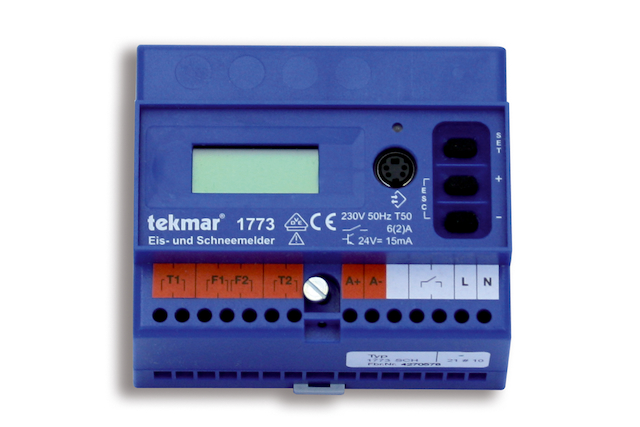 Roth Eis- und Schneeregler digital mit Feuchteueberwachung Der Roth Eis- und Schneeregler digital Typ 1773 hat in Verbindung mit dem kom- binierten Roth Feuchte- und Temperatur- fuehler Typ 3356 die Aufgabe, Eis und Schnee fruehzeitig zu erkennen und durch das Einschalten der Roth Freiflaechen- heizung die ueberwachten Flaechen schnee- und eisfrei zu halten. Es koennen bis zu zwei Roth Feuchte- und Temperaturfuehler angeschlossen werden. Die Montage erfolgt auf Hutschiene 35 mm nach DIN 43880.