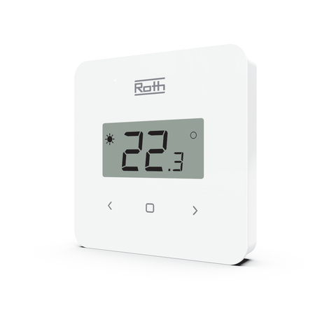 Roth Funk-Raumbediengeraet Touchline SL Standard Zur Funk Einzelraumregelung in Verbindung mit Funk-Anschlussmodulen Touchline SL, Touchline SL R2 und Touchline PL. Bedienung durch 3 Sensortasten und gros LC-Display. Fuer Heiz-und Kuehlbetrieb geeignet. Zusaetzliche Messung der Raumluftfeuchte. Die Funk-Reichweite betraegt ca. 30 m, die Signalstaerke kann am Funk- Anschlussmodul angezeigt werden. Mit Tastensperr-Funktion ohne Passwortschutz. Montage ohne Kabel-Bodentemperaturfuehler auf Wand und auf Standard-Unterputzdose moeglich. Montage mit Kabel-Bodentemperaturfuehler nur auf Standard-Unterputzdose moeglich. Der Bodentemperaturfuehler ist optional und wird separat bestellt. Einschlieich 2 Batterien Typ AAA.
