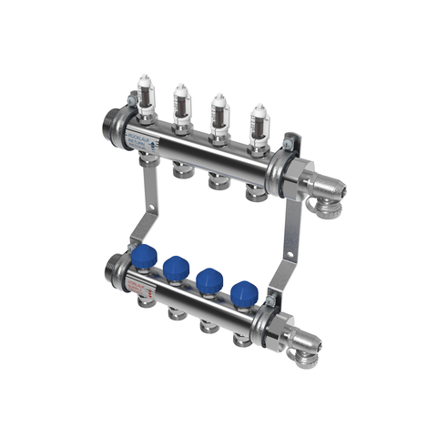 Roth Industrieverteiler mit DFA HK 5 1 1/4"/absperrbar/Edelstahl Die Vorlauf-/Ruecklaufrohre bestehen aus Edelstahl und koennen von links oder rechts ueber die flachdichtenden 1 1/4" Aungewinde angeschlossen werden. Vorlauf: mit absperrbaren Durchfluss- anzeigen (Anzeigebereich: 0-6 L/min.). Ruecklauf: mit integrierten Thermostat- ventilen zum Einstellen der Durch- flussmenge/Heizkreise. Die Anschluesse der Heizkreise erfolgen mit 3/4" Eurokonus (Systemrohr 20 mm). Der Verteiler ist auf Konsolen vor- montiert. Lieferumfang: Verteiler, Endstuecke mit Absperrung zum Befuellen/Entleeren/ Entlueften, Bezeichnungsschilder und Montageanleitung.