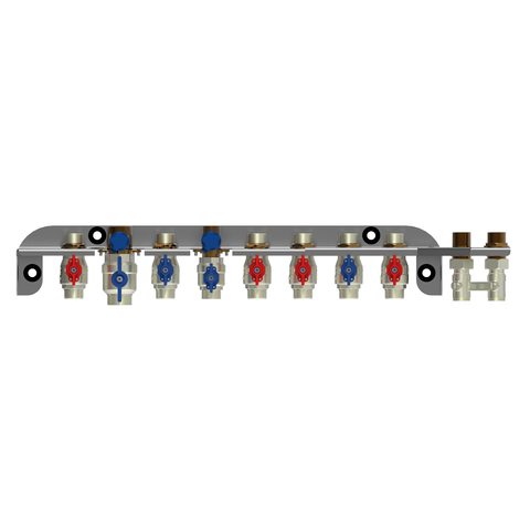 Roth Kugelhahnleiste FlatConncet F FH HT C Kugelhahnleiste F FH HT C bestehend aus: - Montageplatte aus verzinktem Stahlblech mit schallentkoppelten Befestigungspunkten - vormontierte Kugelhaehne mit Anschlussgewinde AG, Trinkwasser geeignet Ausfuehrung der Absperrarmaturen: - 7 Absperreinrichtungen G3/4" AG - 1 Absperreinrichtung G1" AG - 2 Anschlussuebergaenge G3/4" AG