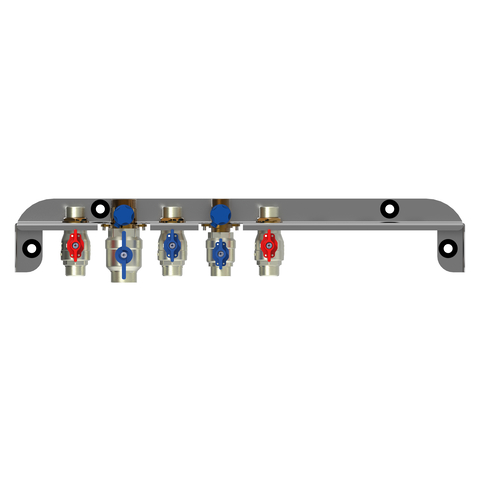 Roth Kugelhahnleiste FlatConnect F Kugelhahnleiste F bestehend aus: - Montageplatte aus verzinktem Stahlblech mit schallentkoppelten Befestigungspunkten - vormontierte Kugelhaehne mit Anschlussgewinde AG, Trinkwasser geeignet Ausfuehrung der Absperrarmaturen: - 4 Absperreinrichtungen G3/4" AG - 1 Absperreinrichtung G1" AG