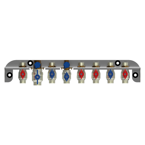 Roth Kugelhahnleiste FlatConnect F FH/R C Kugelhahnleiste F FH C bestehend aus: - Montageplatte aus verzinktem Stahlblech mit schallentkoppelten Befestigungspunkten - vormontierte Kugelhaehne mit Anschlussgewinde AG, Trinkwasser geeignet Ausfuehrung der Absperrarmaturen: - 7 Absperreinrichtungen G3/4" AG - 1 Absperreinrichtung G1" AG Hinweis: Verwendbar auch fuer Wohnungsstation BM 15/20 F R C