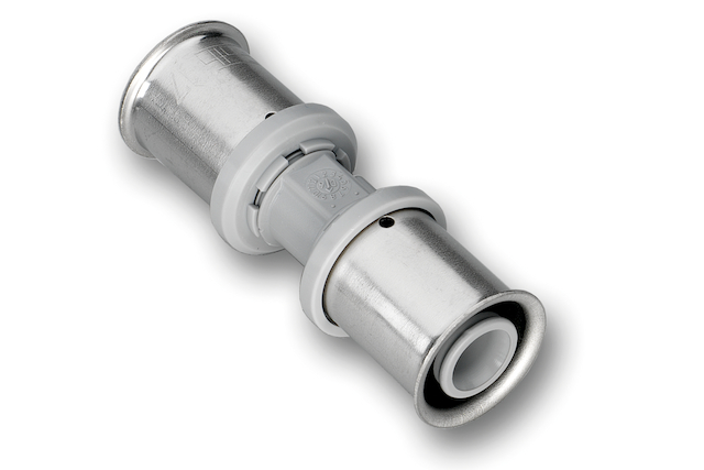 Roth Kupplung 50x50mm/PPSU KU-Pressfitting, hergestellt aus dem Hochleistungskunststoff PPSU und MS- Pressfitting aus Messing. Kupplung mit Stuetzkoerper und zwei fixierten Edelstahl-Huelsen fuer die unloesbaren Verbindungen mit den Roth Systemrohren Alu-Laserplus.