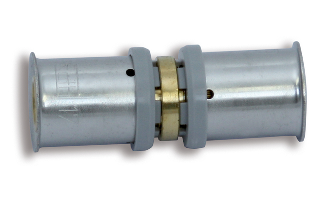 Roth Kupplung PressCheck 16mm/Messing Bestehend aus: Doppelstuetzkoerper und zwei fixierten Edelstahl-Huelsen fuer die unloesbare Verbindung aller Roth System- rohre.