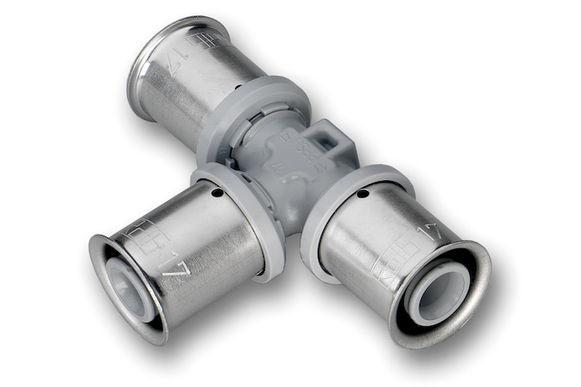 Roth T-Stueck 40x40x40mm/PPSU KU-Pressfitting, hergestellt aus dem Hochleistungskunststoff PPSU und MS- Pressfitting aus Messing. T-Stueck mit Stuetzkoerper und jeweils drei fixierten Edelstahl-Huelsen fuer die unloesbaren Verbindungen mit den Roth Systemrohren Alu-Laserplus.