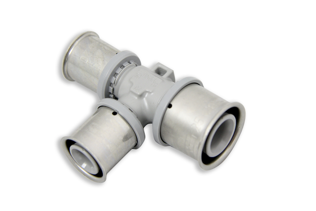 Roth T-Stueck im Abgang u.Durchgang red. 25x17x20mm/PPSU KU-Pressfitting, hergestellt aus dem Hochleistungskunststoff PPSU und MS- Pressfitting aus Messing. T-Stueck mit Stuetzkoerper und jeweils drei fixierten Edelstahl-Huelsen fuer die unloesbaren Verbindungen mit den Roth Systemrohren Alu-Laserplus.