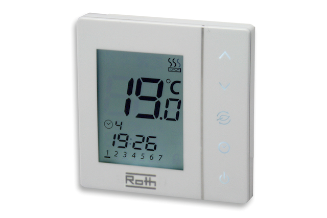 Roth Uhrenthermostat Basicline T Elektronisches, digitales Raumthermostat mit Wochenschaltuhr, grom beleuchtetem Display und 5 Sensortasten. Geeignet zur Pilotsteuerung in Verbind- ung mit allen 230 V Basicline Thermos- taten. Mit Betriebsartenschalter: Automatik, Komfort, Absenkbetrieb und Frostschutztemperatur sowie Urlaubs- funktion. Mit Anschluss fuer optionalen Boden Temperaturfuehler 1135007621.