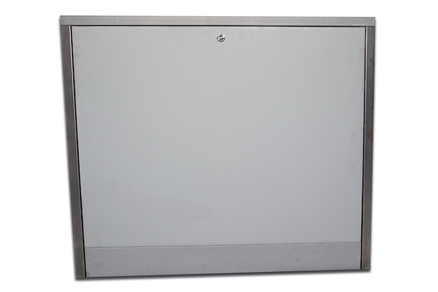 Roth Verteilerschrank Gr.2 fuer Industrieverteiler 1 1/2"/verzinkt Verteilerschrank aus sendzimir verzink- tem Stahlblech fuer den Roth 1 1/2" In- dustrieverteiler. Bei den Verteiler- schraenken handelt es sich um eine Haubenausfuehrung ohne Rueckwand zur Aufputz-Montage. Der Verteiler verfuegt ueber herausnehm- bare und abschlieare Tueren. Zur Be- festigung an der Wand sind die vorge- sehenen Aussparungen an der Rueckseite zu verwenden. Seitlich sind jeweils 2 Vorstanzungen zum gewuenschten Anschluss der Versorgungsleitung vorgesehen. Diese sind bauseits auszubrechen. Hinweise: Im Falle einer Lackierung ist die Bau- teiloberflaeche zu grundieren. Fuer den Betrieb mit geschlossenen Kugel- haehnen (und geschlossener Tuer) muessen die Kugelhaehne um 45 Grad nach unten gedreht werden. Die Verteilerschraenke sind nicht hoehen- oder tiefenverstellbar. Befestigungsmoeglichkeiten/Ausstanzungen sind an der Innenseite im umlaufenden Rahmen vorgesehen.