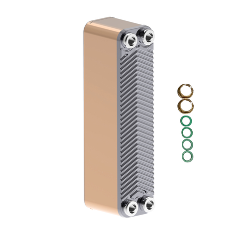 Roth Waermetauscher WS15/Ersatzteil FlatConnect Kupfergeloeteter Edelstahl- Plattenwaermeuebertrager (42 kW), 40 Platten mit speziellen Profilstroemungskanaelen fuer verbesserte Waermeuebertragung, mit mineralischer Oberflaechenversiegelung zur Verbesserung der Bestaendigkeit gegen Ablagerungen, Verschmutzungen und Korrosion bei Anspruchsvollen Trinkwasser-Qualitaeten, 4 Anschlussgewinde G 3/4"AG flachdichtend nach DIN EN ISO 228-1. 2 Stueck Gewindemuttern SW 30 mit O-Ring Dichtung 3/4", 2 Stueck Faserweichdichtung 3/4" x 2 mm fuer Heizungsanwendung, 2 Stueck Faserweichdichtung 3/4" x 2 mm fuer Trinkwasseranwendung.