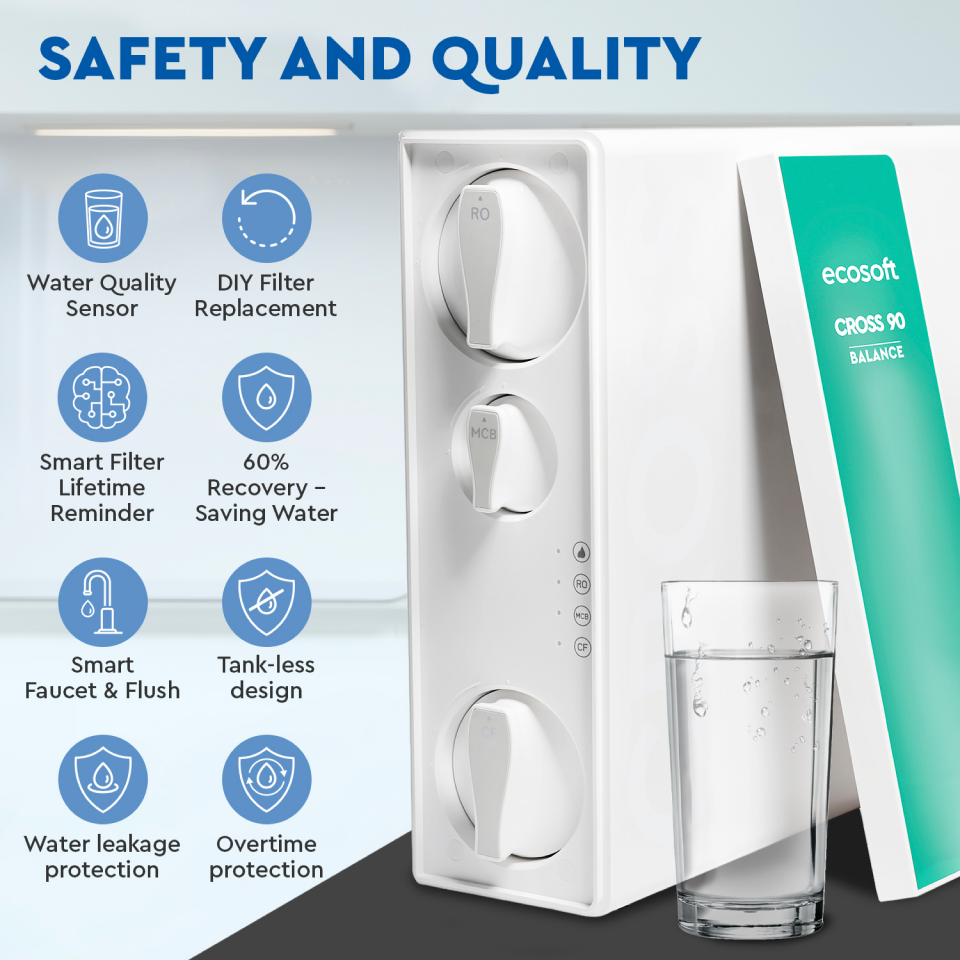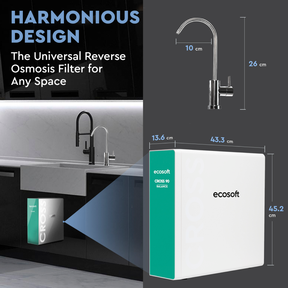 BWT Ecosoft CROSS90 DURCHFLUSSRATE: 1,5 l/min dank direct flowEFFIZIENT: Nur 50% AbwasserFILTERWECHSEL: Smarte Wechselanzeigen am Wasserhahn und SystemSMART FLUSHING: Automatisches SpülprogrammSCHLANKES DESIGN: Spart Platz unter der SpüleDurch die spezielle Membran-Filtertechnologie, dem sogenannten Umkehrosmose-Filtersystem, werden PFAS, Schwermetalle, Mikroplastik, Bakterien, Viren, Hormone, Nitrate, Kalk und andere Schadstoffe zu 99 % aus dem Wasser entfernt. Übrig bleibt reinstes H2O zum Kochen, Waschen von Obst und Gemüse und natürlich zum Trinken. Und das Beste: dazu werden keinerlei Chemikalien benötigt. FiltertechnologieCF: PP-Sediment und Aktivkohlefilter entfernt effektiv Sedimente, Rost, Chlor und chemische Verunreinigungen.RO: 600 GPD-Membran, Filtert über 99% aller Verunreinigungen wie z.B. Mikroorganismen und PFAS aus dem Wasser und eliminiert unerwünschte Geschmacks- und Geruchsstoffe.CB: Aktivkohlefilter, verfeinert zusätzlich den Geschmack und Geruch des Wassers, sorgt für ein reines Trinkerlebnis. FilterwechselDank der smarten LED-Filterwechselanzeigen am Wasserhahn und am System, sowie einem akkustischen Signal werden Sie garantiert nie auf einen Filterwechsel vergessen!CF: Alle 6 MonateRO: Alle 24 MonateCB: Alle 12 MonateTechnische DetailsBetriebstemperatur :5 - 30 °CDurchflussrate:1,5 l/min | 90 l/hEingangsdruck:2 - 5 barFilterwechselanzeige:LED Anzeige & Akustisches SignalGewicht:11 kgRückgewinnungsrate:55 - 65 %Stromversorgung:230 / 50 HzECOSOFT 22 BV Leuvensesteenweg 633 1930 Zaventem Belgium Phone +32 016 60 77 71 E-mail: belgium@ecosoft.com Web: ecosoft.com Allgemeine Sicherheitshinweise: Zur Vermeidung von Körper- und Gesundheitsschäden sind die Montage, Erstinbetriebnahme, Inspektion, Wartung und Instandsetzung von autorisierten Fachkräften (Heizungs- / Sanitärfachbetrieb / Vertragsinstallationsunternehmen) vorzunehmen! Bestimmungsgemäße Verwendung: Bitte beachten Sie die bei Installation und Montage beiliegende Installations-, Betriebs- und Wartungsanleitungen sowie Produkt-/Systemzulassungen aller Anlagenkomponenten. Bei Wärmeerzeugern ist es zum Beispiel regelmäßig der Fall, dass allein für diese Heizung zugelassene Abgastechnik zur Verwendung gelangen darf. Zur bestimmungsgemäßen Verwendung gehört gleichsam die Einhaltung der ebenfalls in o.g. Unterlagen enthaltenen Inspektions- und Wartungsbedingungen. Installation, Inspektion, Wartung und Instandsetzung von Gasgeräten sowie Gaseinstellungen darf nur ein Fachhandwerker durchführen! Die Installation eines Klimageräts oder eine Wärmepumpe darf nur durch ein nach der Verordnung (EU) Nr. 573/2024 des Europäischen Parlamentes und des Rates vom März 2024 über fluorierte Treibhausgase zertifiziertes Unternehmen erfolgen. Mit dem Kauf einer Split-Klimaanlage oder Split Wärmepumpe bestätigen Sie die fachgerechte Installation durch zertifiziertes Fachpersonal. Elektrische Heizgeräte sowie Durchlauferhitzer mit Starkstromanschluss (400V) dürfen nur durch jeweiligen Netzbetreiber oder durch ein in das Installateur-Verzeichnis des Netzbetreibers eingetragenes Installationsunternehmen installiert werden! Elektrogeräte mit Drei-Phasen-Wechselstrom-Anschluss (3~/400V) und "nicht-steckerfertigen Geräten" sind von einem Fachbetrieb zu installieren. Geräte mit einer Nennleistung von mehr als 12 kW müssen vor der Erstinstallation eine Zustimmung vom Netzbetrieber erhalten. Installation, Inspektion, Wartung und Instandsetzung von Gasgeräten sowie Gaseinstellungen darf nur ein Fachhandwerker durchführen!